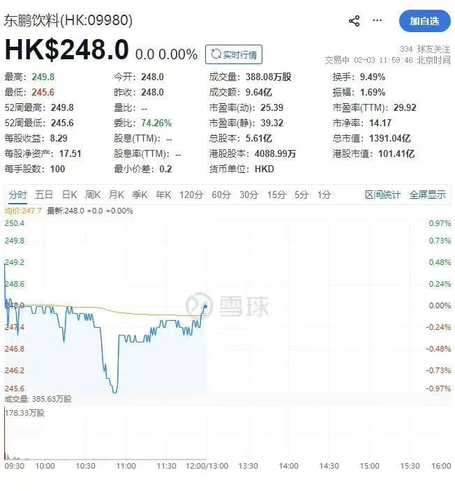 中国饮料巨头加速奔赴全球资本舞台,东鹏饮料2月3日正式在香港主板上市,完成“A+H”双资本布局,向全球化饮料企业进阶。东鹏饮料开盘报248港元,平招股价,盘前成交额为4.2亿港元。